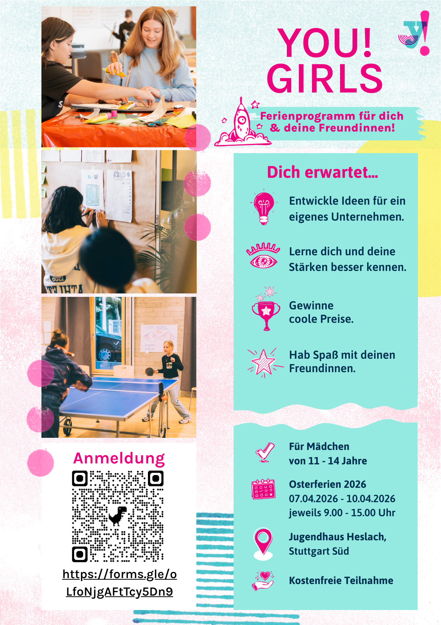 Die erste YOU! GIRLS Woche findet vom 7.4.-10.4.2026 im Jugendhaus Heslach statt! Mehr Infos hier.